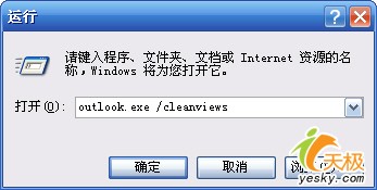 2.在“运行”对话框中输入 outlook.exe /cleanviews ,如下图所示: