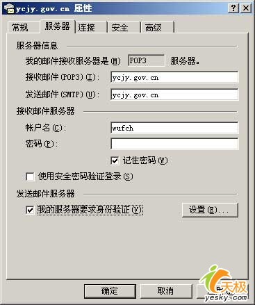 返回到Internet帐户列表窗口中的“邮件”标签页面,并在其中选中刚刚创建好的电子邮件帐号项目,同时单击“属性”按钮,进入该电子邮件的帐号属性设置界面;单击该界面中的“服务器”标签,打开如图1所示的标签页面,选中该页面中的“我的服务器要求身份验证”复选项;