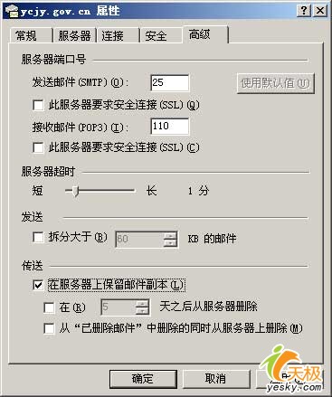 下面再单击电子邮件帐号属性设置界面中的“高级”标签,在其后出现的如图2所示标签页面中,将“传送”设置项处的“在服务器上保留副本”的项目选中,最后单击“确定”按钮,这样的话我们每次对外发送的电子邮件都会自动在邮件服务器中保留一个副本,以后我们根据副本就能弄清楚邮件的发送情况了。