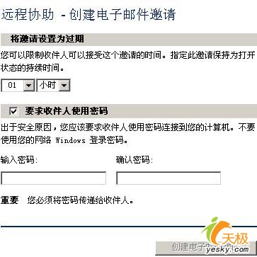 在邀请对方参加远程协助时,可以用鼠标逐一单击“开始”/“程序”/“远程协助”命令,在其后弹出的帮助界面中,单击“邀请某人来帮助您”的选项,之后屏幕会出现如图4所示的提示界面,询问我们使用何种方式来联系自己的助手。此时,我们可以选用电子邮件方式,并将对方用户的电子邮件地址填写在“电子邮件”文本框中,再单击一下“继续”按钮,打开如图5所示的创建电子邮件邀请编辑界面。为了确保远程控制的安全性,我们必须在这里设置好邀请的生效时间,以避免自己不在计算机旁边时,对方偷偷通过远程控制方式做出对本地系统不安全的事情来;另外,我们还应该在图5所示的界面中设置好远程连接的访问密码,确保对方必须通过密码才能和本地计算机进行远程连接。当然一旦在这里启用了访问密码的话,我们必须通过电话或电子邮件将访问密码及时通知对方。做好上面的安全设置工作后,再单击一下图5界面中的“创建电子邮件邀请”按钮,随后Windows系统就会自动把远程协助邀请信息以电子邮件方式发送给对方了。一旦远程协助邀请被成功发送出去后,我们还可以在其后出现的界面中,通过执行“发送新邀请”命令,来创建另外一个远程协助邀请,通过执行“查看邀请状态”命令,来浏览以前的远程协助邀请信息等。