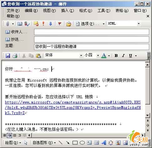 完成上面的准备工作后,我们现在就可以向对方发出参加远程协助的邀请,到时对方一旦收到该邀请就会自动获得一个远程连接的URL地址,之后对方只要使用该远程连接的URL地址,打开一个远程协助对话框,同时进行肯定回答,我们就能轻易看到对方工作站的桌面,并向对方工作站复制、传输文件信息了。