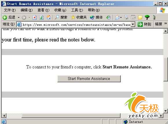 如果对方愿意接受我们的远程协助邀请,允许我们直接对其计算机进行远程控制的话,那他就可以进入电子邮件接受页面,接收我们发送给他的远程协助邀请邮件,打开该邮件后对方将看到一个如图6所示的邀请信息,将其中的URL地址直接复制粘贴到IE浏览器的地址框中,单击回车键后,IE浏览器会自动检查本地系统中是否安装了Remote Assistance程序,要是没有的话我们必须到网上下载一个Remote Assistance程序,并按正确方法将它安装好后,再次输入前面的URL地址打开如图7所示的浏览页面,最后单击其中的“Start Remote Assistance”按钮,进入远程协助身份验证对话框,正确将访问密码输入后,再单击“是”按钮,这样我们就能将对方计算机的桌面打开了,同时我们还能向对方直接传送文件或者发送即时信息,不过到了这里,我们还并不能对对方桌面进行任何实质性的控制操作。