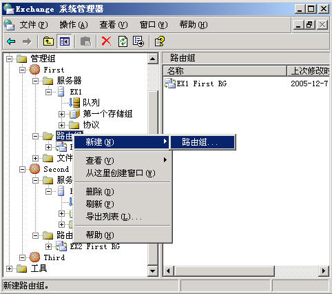 从以上截图中,可以看到以下信息:“First”这个管理组下有一台名为“EX1”的Exchange服务器,里面只有一个路由组,名字是“EX1 First RG”,“Second”管理组里有一台名为“EX2”的Exchange服务器,里面也只有一个路由组,名字是:“EX2 First RG”,“Third”这个管理组由于是新建的,所以里面什么都没有。那我们现在就准备到“First”管理组里的路由组容器下去新建一个名为“EX1 Second RG”的路由组。我们选中“First”管理组下的路由组容器,然后击右键: