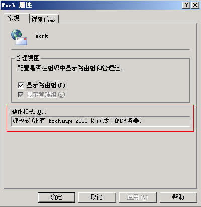 请大家注意红框的地方,操作模式一定要是纯模式才可以。如果是混和模式那是不行的,而且要提升到纯模式,还必须保证你的整个森林里没有Exchange 5.5的服务器。并且这个提升操作是不可逆的。