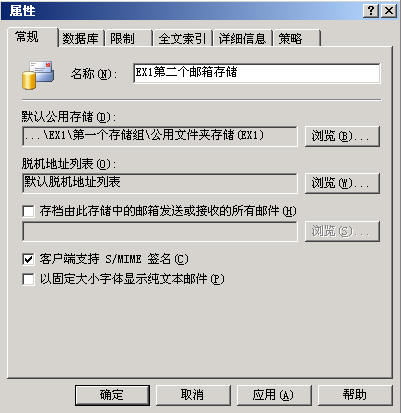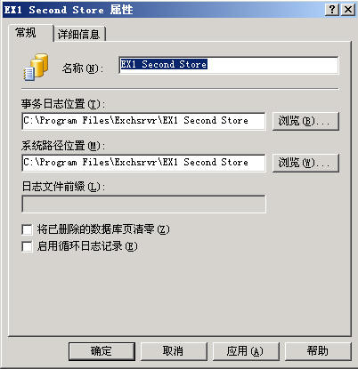 在这里存储组名称设为“EX1 Second Store”,那么上图中的“事务日志位置”和“系统路径位置”大家可以自行设定,建议不要设在一起,最好是设在两个不同的驱动器上,至于下面的“将已删除的数据库页清零”和“启用循环日志记录”前的勾请大家尽量不要选上,因为这两个选上后,对以后的一些灾难恢复是非常不利的,尤其是Exchange的日志,可不是一般的记录一下而已,对于我后面要讲到的灾难恢复是很有用的。选择好以后,点击“确定”: