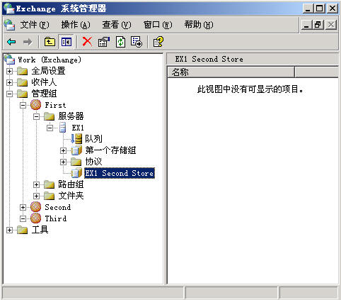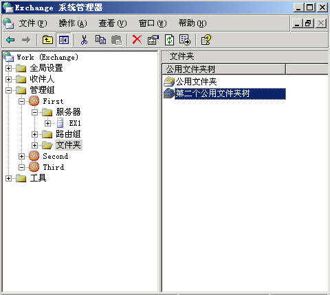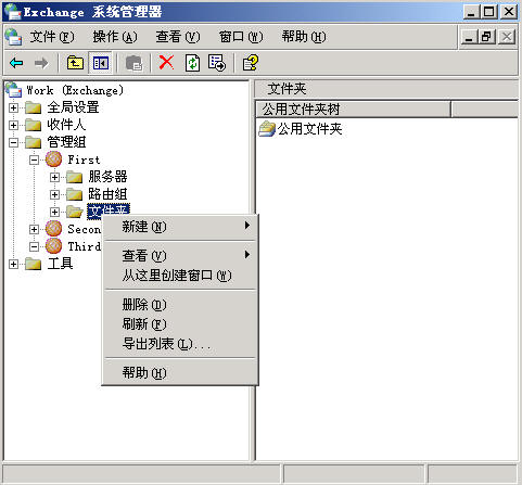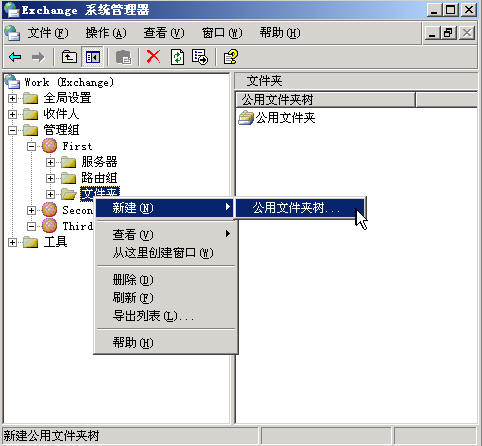 大家可以看到“EX1 Second Store”已经创建成功了,只是里面没有什么东西,那我们现在就在里面创建一个“公用存储”和“邮箱存储”,要创建“公用存储”就必须先创建一个“公用文件夹树”,展开“First”,在“文件夹”上击右键: