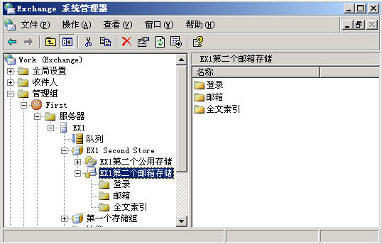 建立完成后,再依次展开“First-服务器-EX1”,在我们刚刚建立的“EX1 Second Store”上击右键,选“新建”:
