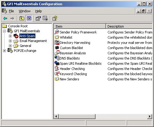 让我们走进ME配置工具。选择“开始”|“程序”|“GFI Mail Essential”|“Mail Essentials Configuration”来打开工具。(如图14)。这里提供了一个清爽的界面来管理这一产品。我发现这个配置工具的操作非常人性化。ME配置分成三个主要的板块:Anti-Spam(反垃圾邮件)、E-mail Management (电子邮件管理)和General(常规)。