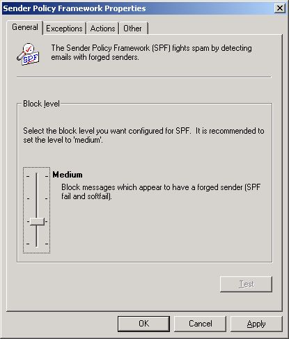 General Tab(常规表单,如图15)让SPF可以工作在不同的层上。把滑块拖动到顶端,能够设置让SPF不要阻拦信息,这样就关闭了该规则。相反,把滑块拖动到底端,则会阻拦任何没有通过SPF测试的邮件。GFI推荐中级设置,该设置会阻拦那些伪造发件人的邮件。