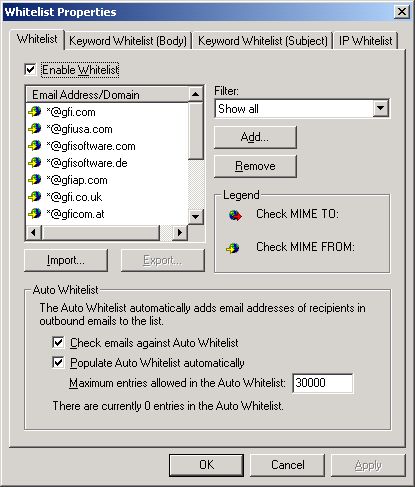 接下来的SPAM filter is the white list(垃圾邮件过滤器是白名单)。(如图18)。白名单在缺省状态下为激活,它也是最古老的垃圾邮件防范技术之一。ME自动地根据发出的邮件来建立白名单。其他选项包括手动增加电子邮件地址或者从列表导入白名单。