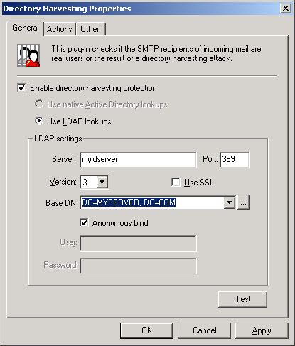接下来的过滤器是Directory Harvesting(帐号收集)。这一规则检查那些发往电子邮件服务器中,不存在的收件人的电子邮件。这通常是帐号收集攻击的一个信号,目的是发现特定服务器上的邮件地址。在我的环境中,我们收到大量的垃圾邮件,这些垃圾邮件都是发给已经离开公司的员工的。使用这一过滤规则能够帮助我们直接把这些邮件处理掉,以免我们还要在以后对它们进行处理,判断它们是否合法。可以在“general”(常规)表单中激活这一功能。使用该功能需要AD或者LDAP连接到DC。(如图20)。