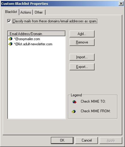 每条规则的属性都被分成几个表单。有些表单,比如Actions表单在每条规则中都是一样的。配置过程类似这样:按照需要选择使用每条规则,仔细进行配置,并规定在发现符合该规则的垃圾邮件之后应该采取什么行动。