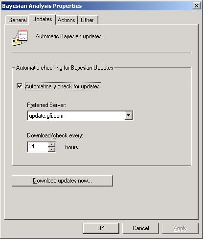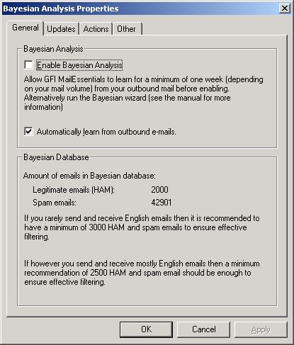 Bayesian filter(贝叶斯规则过滤)是ME中主要的垃圾邮件过滤功能。Bayesian过滤在缺省状态下是关闭的。(如图22)。GFI推荐至少每周要使用一次该过滤功能,起码直到有3000封邮件通过这一过滤。在这一训练期结束后,就可以正式使用该过滤功能了。