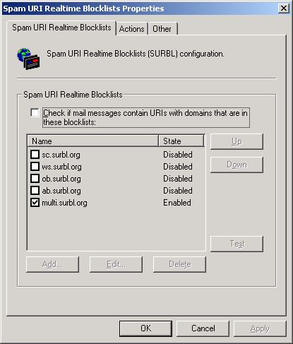 Spam URI Real-time Block(垃圾邮件URL实时阻止,见图25)列表规则检查电子邮件,查看邮件中是否包含了已知的、来自于垃圾邮件制造者的URL和URN。可以针对每个列表选择多个检查列表。和DNS黑名单一样,选择越多的检查列表,ME产品的邮件处理时间也越长。