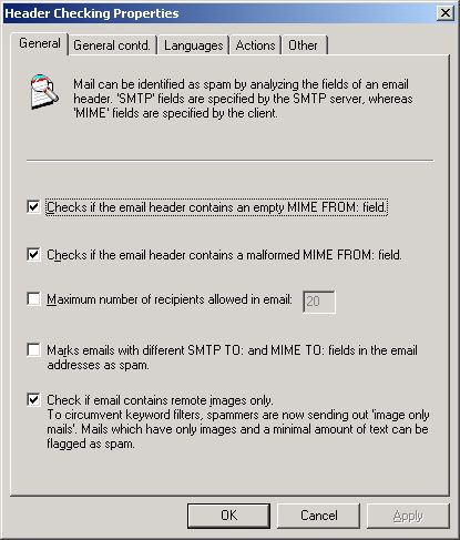 Header Checking rule(标题检查规则)检查电子邮件标题区域、SMTP和MIME。SMTP区域是由发送邮件服务器生成的,MIME区域是由电子邮件客户端生成的。“General tab”和“General Continued”中有八个不同的、可以检查的标准。(如图26)每个检验栏都提供了对相应标准的解释。如果需要每个标准的更详细的说明,可以查看ME文档。