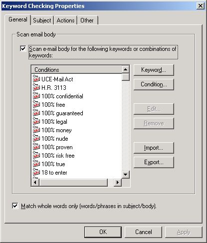 Keyword checking(关键字检查)是最古老的一种对付SPAM(垃圾邮件)的工具。(见图27)很多垃圾邮件都可以通过这一方法被筛选出来。当然这取决于用户的业务,这种方法可能会错误地过滤掉一部分正常的电子邮件。过滤器使用事先定义好的关键字来扫描电子邮件标题和内容。可以通过增加关键字或者条件的方式来帮助过滤器更有效地工作,这样会比仅仅通过一个独立的字来判断邮件要准确得多。例如,可以创建一个条件,在邮件被标记为垃圾邮件之前,根据多个关键字或者词组来判断是否为垃圾邮件。
