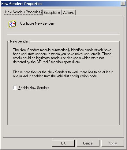 New Senders rule(新发件人规则)会自动地识别那些来自从来没有发送过邮件的邮件地址发来的邮件。这可能是新联系人发来的正常邮件,也有可能是没有被ME中的其他规则发现的垃圾邮件。(见图28)可以在MIME TO地址中设置例外。