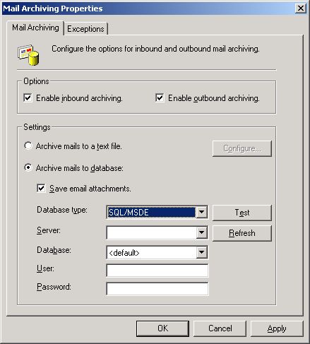 Mail Archiving(邮件存档)功能可以为出、入电子邮件存档。(见图30)。存档可以是没有附件的纯文本文件,也可以存储到SQL/MSDE数据库。可以创建一个HTML搜索页来查询存档电子邮件。尽管该功能还很简单,它仍然为那些希望在有限的预算内、存档电子邮件以达到法律要求的企业,提供了相关的存档能力。GFI还提供了一个专用的电子邮件存档产品。