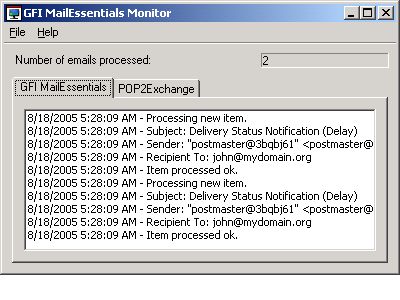 在GFI Mail Essentials程序组中还有其他一些工具。GFI monitor为ME引擎提供了一个实时窗口。这里可以看到电子邮件处理的实际过程。(如图32)。这在最初配置和安装的时候很有帮助。
