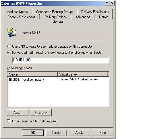 在Exchange System Manager打开SMTP连接器属性。在“常规”中选中“Forward all mail through this connector to the following smart hosts”(把所有通过该连接器的邮件转发到下列主机)选项。添加IP地址,选择新配置的服务器。(如图06)。