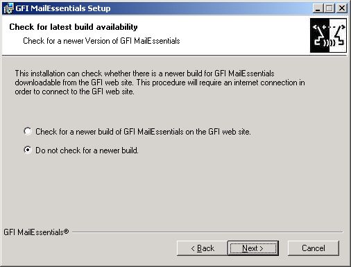 现在SMTP中继已经设立起来,我们可以继续去安装真正的ME产品了。下载的文件会解压,然后开始安装过程。如果是首次安装,安装程序将会让你检查是否有更新的版本。GFI发布新版本的速度很快,所以如果下载了软件但并没有当时安装,等到真正安装的时候,所使用的版本就有可能不是最新的了。如果要检查最新版本,就选择“Check for a newer build of GFI Mail Essentials on the GFI Web site”(在GFI网站上检查是否有GFI Mail Essentials的更新版本),否则就选择“do not check for a newer build”,然后继续安装进程。(如图07)接下来一个窗口提示接受许可证协议,只有接受了安装过程才会继续。