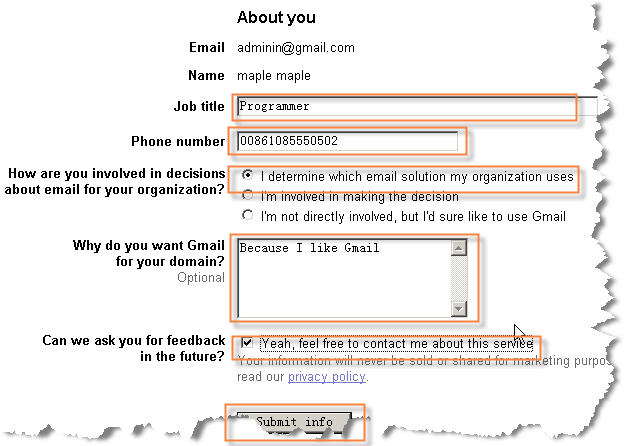 (为什么你想使用Gmail做为你的域名邮箱?我填的是因为我喜欢Gmail,哈哈)