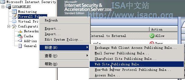 在 ISA 2006 管理控制台中右击防火墙策略,指向新建,选择Web站点发布规则;