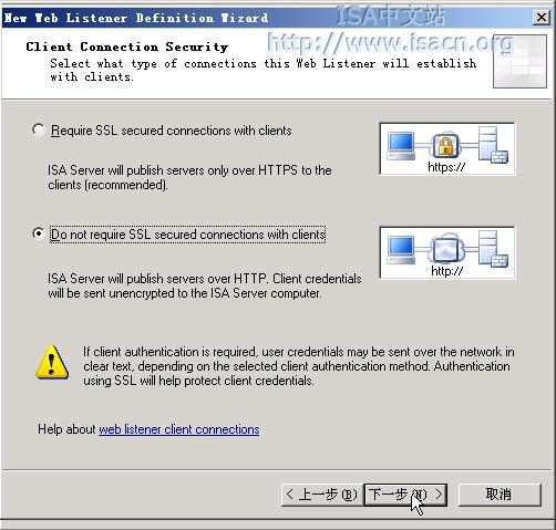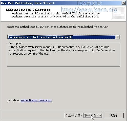 在身份验证设置页,设置 ISA Server 2006 是否对请求访问的客户进行身份验证。需要注意的是,此身份验证是由 ISA Server 要求客户进行,和被发布的Web服务器没有任何关系。不过在ISA 2006中增强了对于身份验证委派的支持,因此你可以设置 ISA Server 要求客户身份验证,然后 ISA Server 再将通过身份验证的客户所提交的身份验证凭据委派到被发布的Web服务器,从而避免客户端被提示要求进行多次身份验证。需要注意的是,默认情况下ISA拒绝通过HTTP协议进行任何身份验证,因此当客户使用HTTP协议访问时,如果ISA的其他配置或被发布的Web服务器要求客户进行身份验证,那么ISA会拒绝客户的访问。我将在以后撰文专门分析ISA Server 2006中的身份验证。