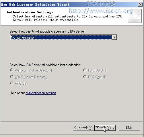 在身份验证委派页,由于我不要求客户进行身份验证,因此选择无委派,并且客户不能直接进行身份验证,点击下一步;
