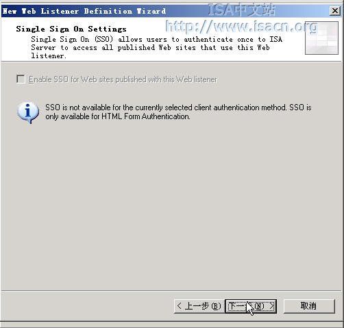 在单点登录设置页,由于只有基于HTTP表单的身份验证才支持SSO,因此无法进行配置,直接点击下一步;