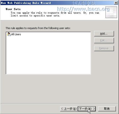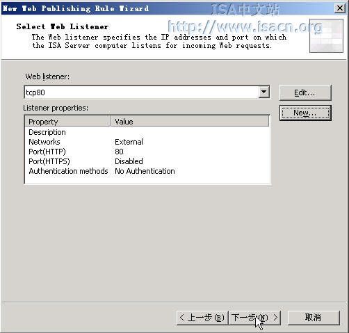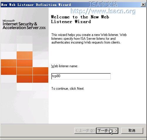 需要注意的是,由于在进行Web发布时,ISA需要占用TCP/IP上的相应端口,因此Web发布规则所侦听的端口如TCP 80需要保证没有被其他应用程序所占用,这个可以通过netstat -b find ":80"来观察。