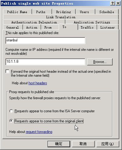 不过默认情况下ISA并未转发客户端原始IP地址给被发布的Web服务器,你可以在Web发布规则属性的到标签进行修改,如下图所示: