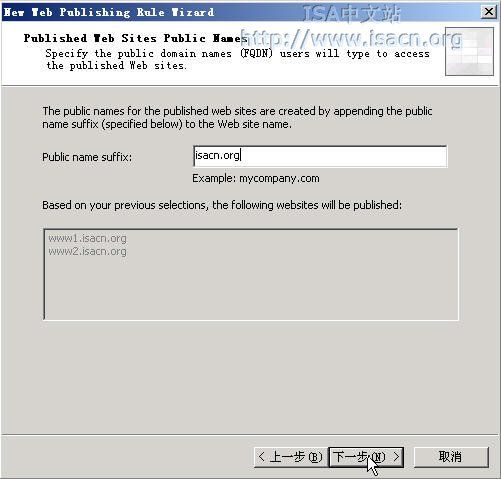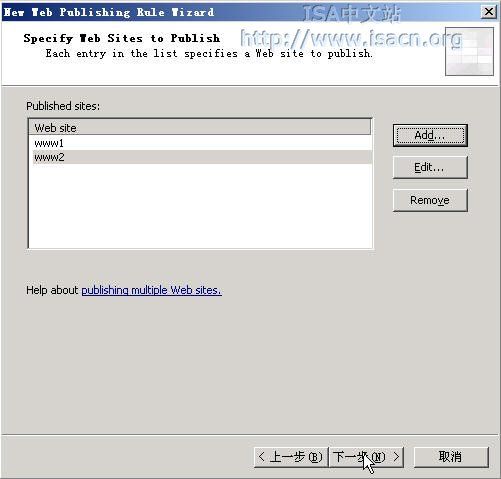 在指定发布的Web站点页,点击添加按钮添加被发布的Web站点的名字,需要注意的是,ISA将使用这个名字来连接到这些Web站点,并且也将这个名字和后面提供的域名后缀相结合以指定Web发布规则中的公共名称。添加完成后点击下一步;