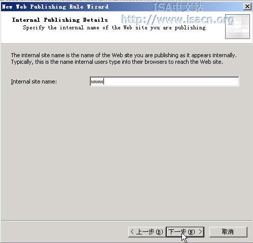 在内部发布细节第一页,在内部站点名栏输入被发布的内部Web站点的名称(Web站点的主机名头),完成后点击下一步;
