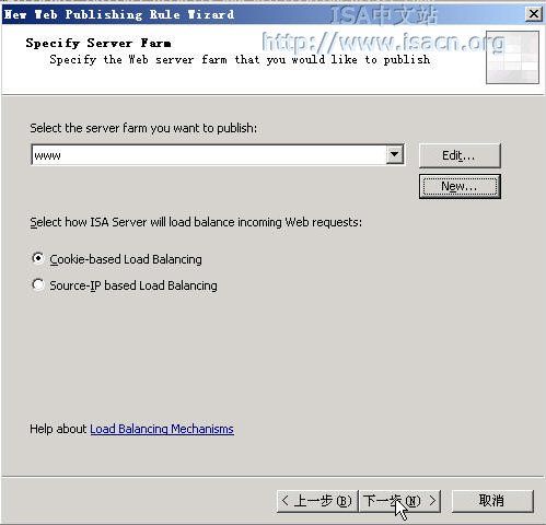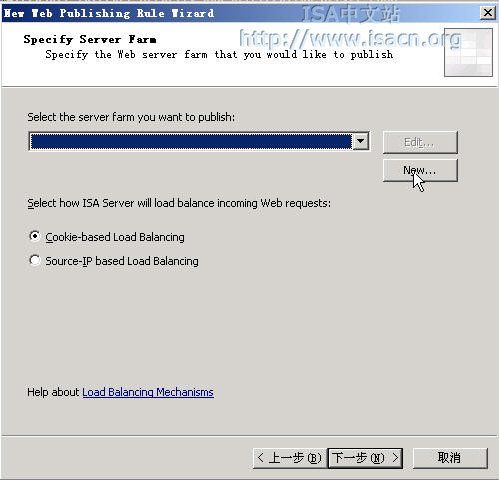 在指定服务器场页,你可以选择 ISA Server 2006 对入站Web请求的负载均衡方式,它们主要是针对故障恢复的场景,ISA Server 2006 中具有以下两种负载均衡模式: