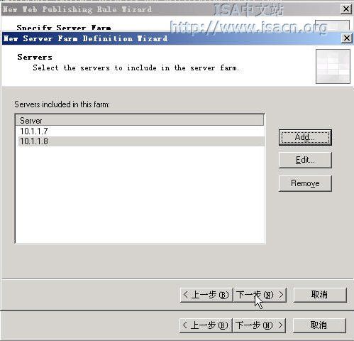 在服务器页,点击添加按钮添加包含在此服务器场中的服务器,建议总是使用IP地址来添加,完成后点击下一步;