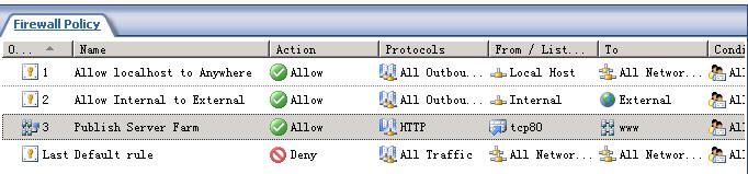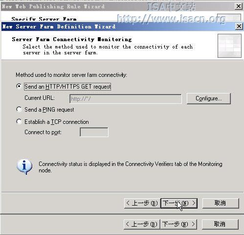 在创建服务器场发布规则的同时,ISA创建一个连接性验证工具,每隔30秒对被发布的服务器场中的每个Web服务器使用HTTP/HTTPS GET进行连接性验证;如果某个Web服务器连接失败,则将客户的访问请求转发到服务器场中其他连接正常的Web服务器 ,以实现容错;