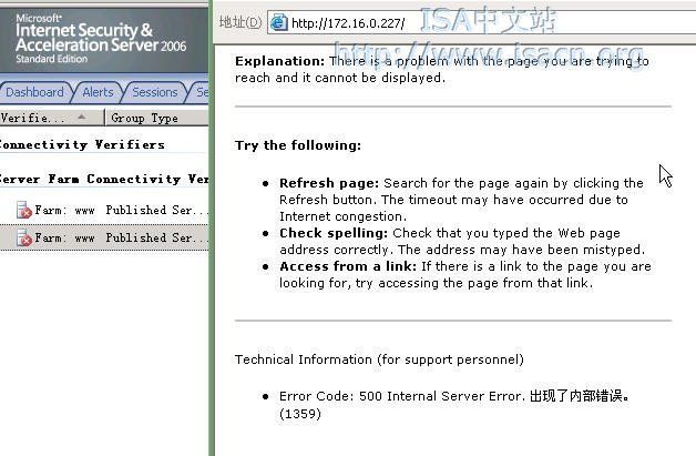 当服务器场中的所有Web服务器均停止服务后,在外部客户端上访问时,提示500内部服务器错误,并且错误代码是1359。