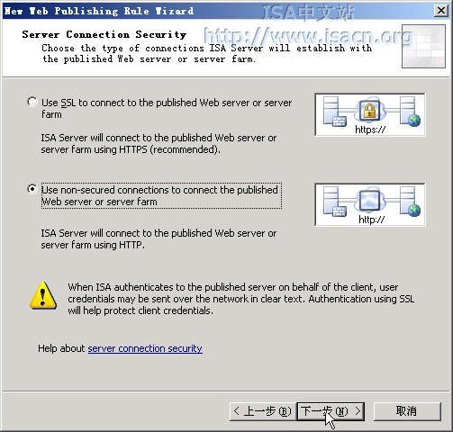 在服务器连接安全性页,选择使用非安全连接来连接到被发布的Web服务器或服务器场(即使用HTTP协议进行连接),点击下一步;