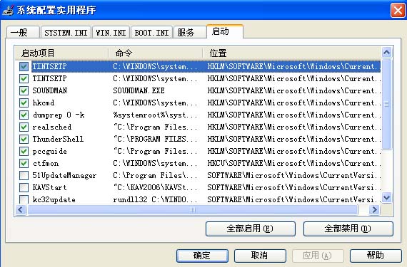 二、开始→运行,输入msconfig→确定。在打开的系统系统配置程序里,将一些不重要的服务以及启动程序关闭,重启电脑。