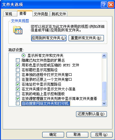 三、进入“我的电脑”——工具——文件夹选项——查看——取消“自动搜索网络文件夹和打印机”的勾选。