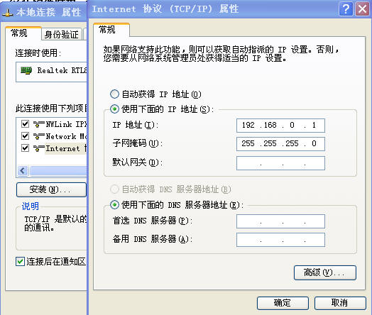 四、开始→设置→网络连接→右击“本地连接”→属性→双击“Internet 协议 (TCP/IP)”→如果IP地址为空的话,点“使用下面的IP地址”指定IP地址和子网掩码。如可以将IP地址设为192.168.0.X(X为1-255之间任一值),子网掩码可设为255.255.255.0→确定→确定。