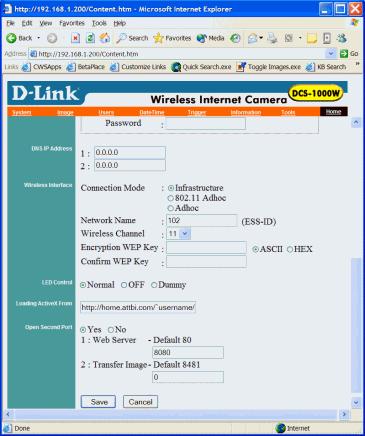 这种摄像机不仅可为传统有线 以太网 提供支持,而且,还具备 802.11b 无线网络功能,并随机配送了一个空白的服务设备标识符(SSID)和一个被预先设定为192.168.0.20的缺省静态IP地址。而在初始状态下,管理界面则未被设定口令保护特性。我使用了一个PCMCIA以太网适配器,并为安装设备单元而使用了跨接电缆,同时,以静态方式将其IP地址配置为192.168.0.21.由于我目前已运行着多个无线网络系统,因此,需要将摄像机纳入其中某一网络,并针对该网络特征就摄像机的无线设置进行相应调整。请注意,如果您需要安装一套完整的家用安全系统,则可在同一网络上使用多部数码摄像机。