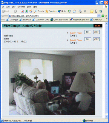 您还可通过Internet从远程位置观看视频流信息。在正确设定Web服务器端口并针对基于家庭办公室内同一路由器的相关端口配置转发功能后,我便为居住在数英里之外的一位好友设置了摄像机用户帐号。这位好友成功捕捉到了远程查看会话期,而我则从他所捕捉到的视频流中生成了一个非常简短的 Windows Media电影文件 .正如您所看到的,配置速率为每秒一帧的流式图像所具备的画质和清晰度相当令人满意。