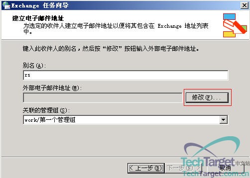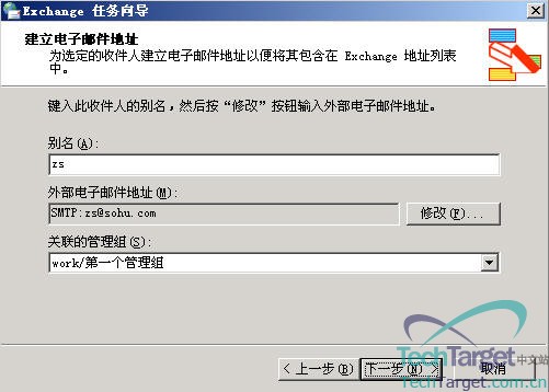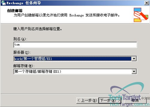 解释完这些功能后,大家再去看我上面那幅图就非常明显了,我们的设定是:tom的邮箱地址是:tom@try.com,邮箱保存在服务器EX1的第一个存储组的邮箱存储里面,设好这些后点“下一步”:
