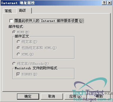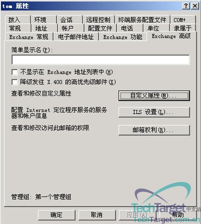 ①、“简单显示名”:这个选项在默认情况下是空的,那什么在什么情况下这个地方才有用呢?当你的网络上存在多台不同语言版本的Exchange服务器,而且你希望用这些服务器来管理整个组织的时候才有用,比如你用中文版式的Exchange系统管理器来管理日文版的Exchange服务器时,由于无法显示所有字符,所以你在这里为相应的用户指定一个简单用户名,以方便显示。