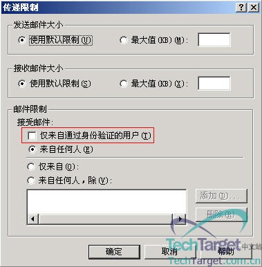 ②、尤其需要提醒大家的时我用红框标出的位置,如果你在“仅来自通过身份验证的用户”前打上勾的话,那么,该用户将无法接到任匿名用户来邮件,也可以理解为无法接收来自Intelnet邮件,因为外网用户是无法通过身份验证的。