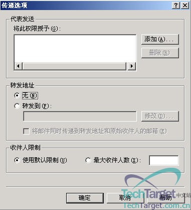 在“Exchange常规”属性里有三个重要的内容,分别是“传递限制”、“传递选项”、“存储限制”,选来点击一下“传递限制”: