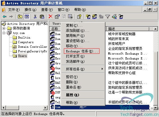 我们来选中上图中的“张三”这个用户,同样是击“右键”,选择“Exchange任务”: