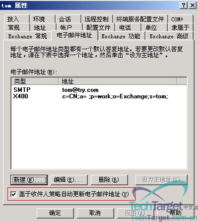 这里其实还是比较简单的,在这个属性项里可以“新建”、“编辑”、“删除”电子邮件地址,我们可以看到默认情况下只有一个SMTP和X400类型的地址,大家可能根据需要来进行操作,另外请大家注意红框部份,“基于收件人策略自动更新电子邮件地址”这个选项默认是被选中的,请大家尽量不要取消这个勾,因为一旦取消,在服务器上设置的收件人策略对这个用户将不起作用。
